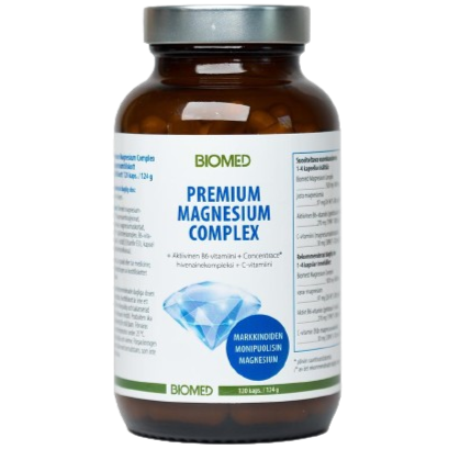 Biomed Premium Magnesium Complex on markkinoiden monipuolisin magnesium. Parhaiden ja hyvin imeytyvien magnesiummuotojen lisäksi tuote sisältää Concentrace -seosta, joka sisältää yli 70 hivenainetta, aktiivista B6-vitamiinia sekä C-vitamiinia.