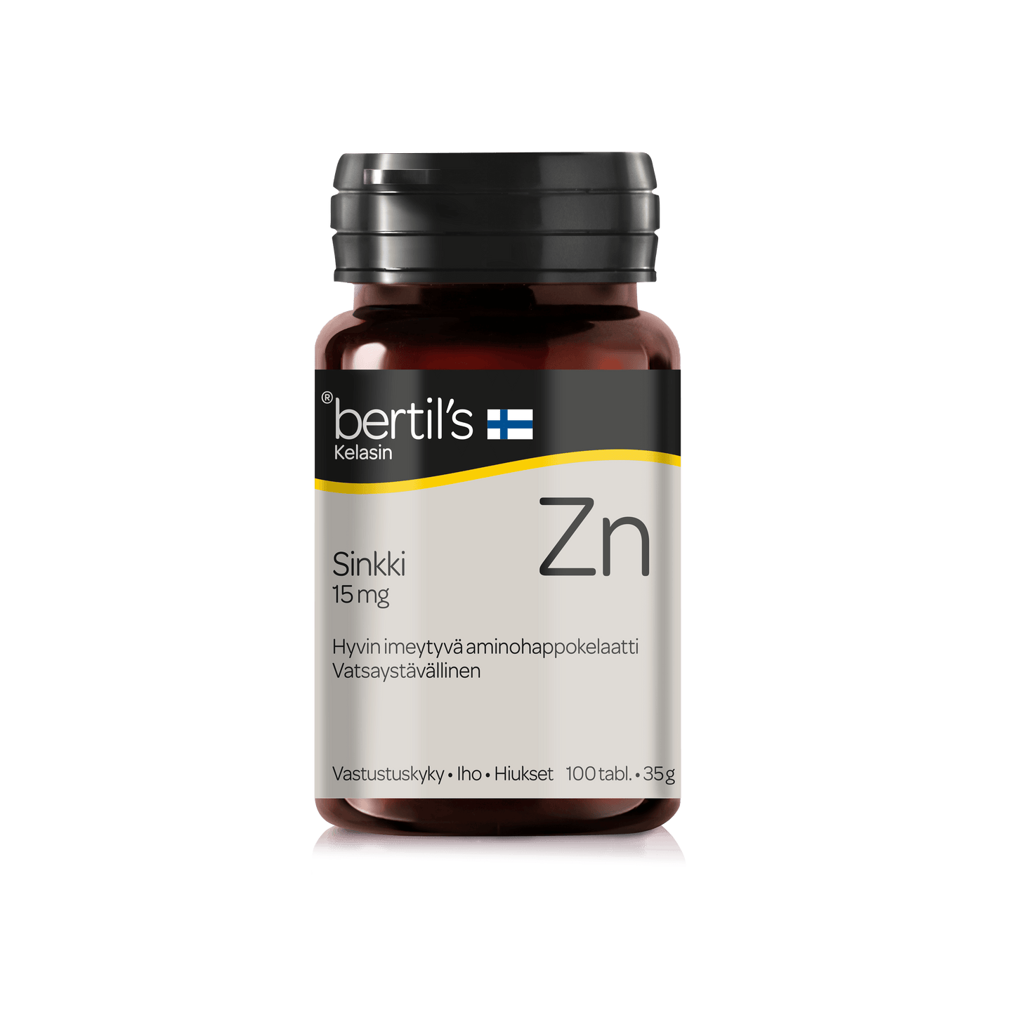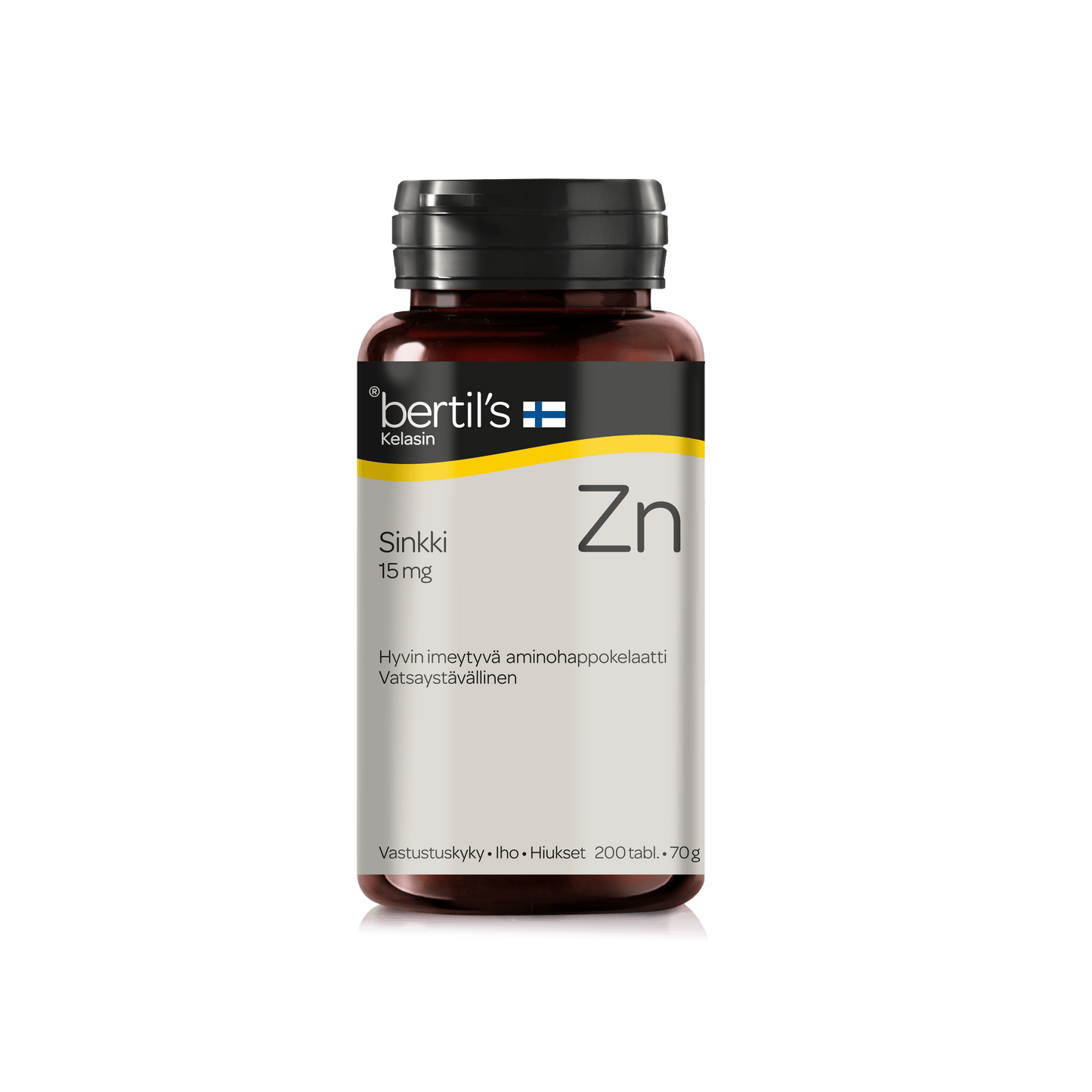Bertil’s Kelasin Sinkki edistää vastustuskyvyn normaalia toimintaa sekä edistää ihon ja hiusten pysymistä normaalina. Ravintolisä.