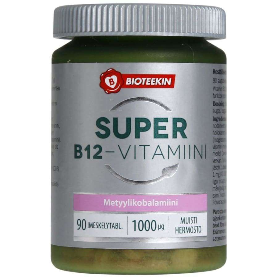 Bioteekin Super B12-vitamiini on vadelmanmakuinen imeskelytabletti, joka sisältää 1 milligramman B12-vitamiinia yhdessä tabletissa. Ravintolisä.