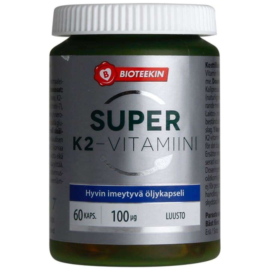 Bioteekki Super K2-vitamiini tarjoaa tehokkaan ja hyvin imeytyvän tavan varmistaa K2-vitamiinin saanti. Luontainen menakinoni-7 on yksi parhaiten hyödynnettävistä K-vitamiinin muodoista. Luontainen menakinoni-7 saadaan fermentoiduista kikherneistä, ja se on yksi parhaiten hyödynnettävistä K-vitamiinin muodoista. K2-vitamiini kuljettaa kalsiumia verenkierrosta luustoon ja edistää näin luiden pysymistä normaaleina. K2 vitamiini on myös tärkeä osa elimistön normaalia veren hyytymisprosessia.