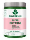 Super Biotiinissa on sekä biotiinia että metioniinia. Biotiini on B7-vitamiini, jota kutsutaan myös H-vitamiiniksi. H-kirjain tulee saksan ihoa tarkoittavasta sanasta Haut. Biotiini on vesiliukoinen vitamiini, joka on erityisen tärkeä hiusten ja ihon hyvinvoinnille. Se osallistuu myös energia-aineenvaihduntaan ja edistää hermoston normaalia toimintaa.