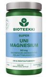 Bioteekin Super Uni Magnesiumissa magnesium on erittäin hyvin imeytyvässä aminohappokelaattimuodossa magnesiumbisglysinaattina sekä omenahappoon sitoutuneena magnesiummalaattina. Aminohappokelaatissa magnesium on heti imeytymisvalmis ja siten sen vaikutus on nopea ja tehokas. Kelatointi suojaa magnesiumia ruoansulatuskanavassa ja kuljettaa sen helposti ohutsuolen limakalvon läpi verenkiertoon.