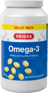 Friggs Omega-3 -ravintolisä sisältää monityydyttymättömiä rasvahappoja, joita löytyy pääasiassa rasvaisista kaloista, kuten lohesta ja makrillista. Omega-3 on monityydyttymättömien rasvahappojen ryhmä, joita elimistö ei pysty valmistamaan itse. Siksi on tärkeää saada ne ravinnon kautta.