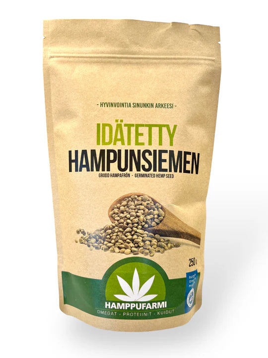 Hamppufarmi Idätetty Hampunsiemen tarjoaa luonnollisen tavan rikastuttaa ruokavaliotasi ravinteilla, joita kehosi tarvitsee. Idätysprosessi poistaa siemenistä suoja-aineita, parantaa imeytyvyyttä ja tekee siemenistä proteiinirikkaamman. Idätetyt siemenet ovat pehmeämpiä sisältä, rapeampia ulkoa ja maultaan makeampia.