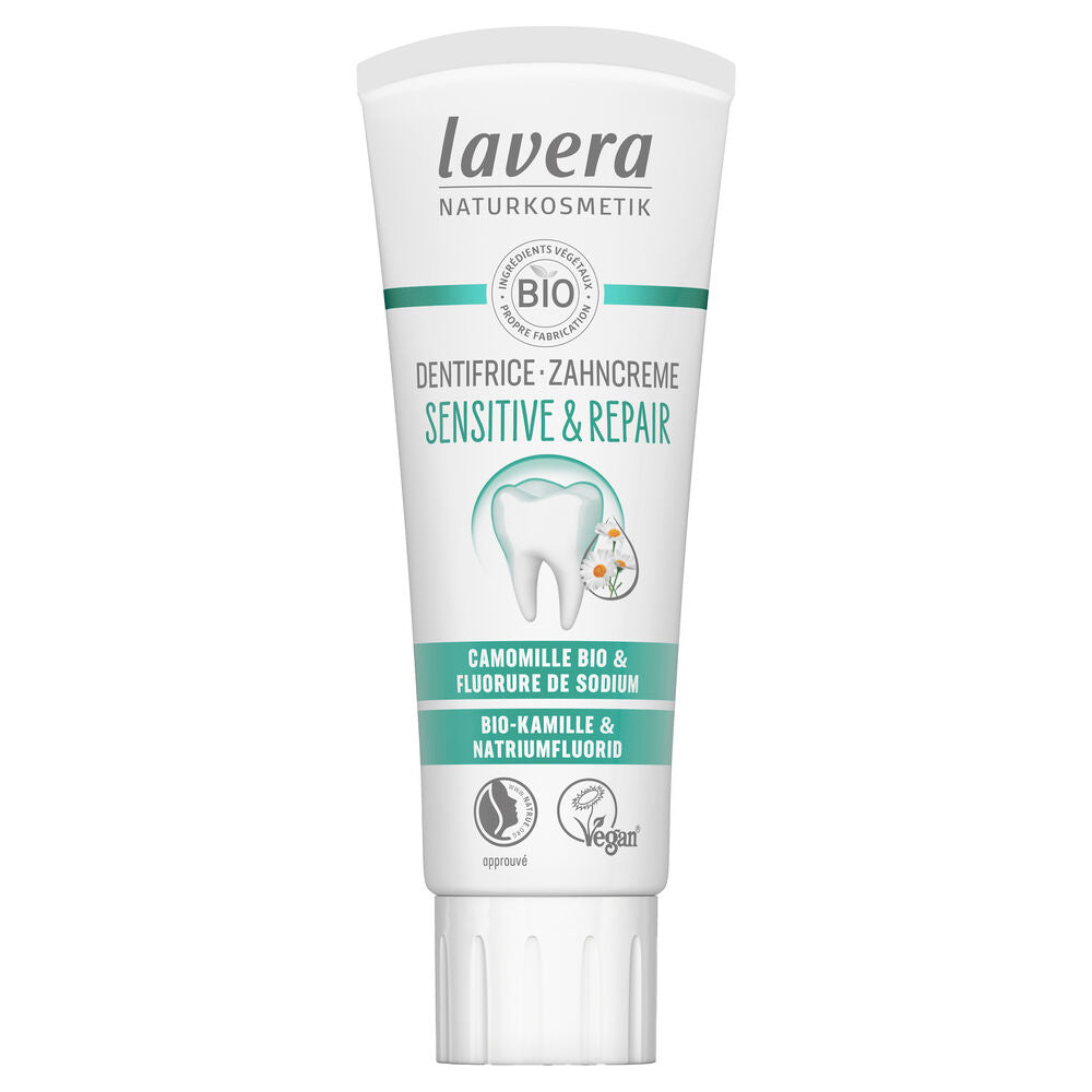 Tahnan sisältämä luomukamomilla rauhoittaa ja aloe vera suojaa ja kosteuttaa ikeniä ja suuta. Lisäksi hammastahna sisältää fluoria, joka ehkäisee hampaiden reikiintymistä ja tarjoaa kattavan suojan suun terveydelle. Lavera Toothpaste Sensitive & Repair jättää suun ja hengityksen raikkaaksi ilman titaniumdioksidia.