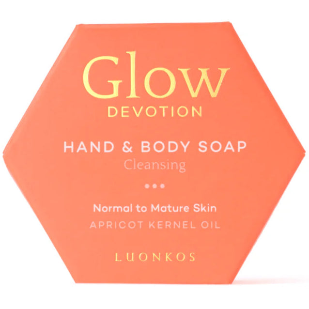 Luonkos Glow Devotion on täyteläinen käsien ja vartalon hoitosaippua. Aprikoosinkiviöljy pehmentää ja ravitsee ihoa samalla kun kookosöljy vaahtoaa runsaasti ja poistaa lian tehokkaasti. Täydellinen valinta ikääntyvälle tai normaalille iholle, joka kaipaa päivittäistä hoivaa. Sopii hyvin myös sheivaukseen.