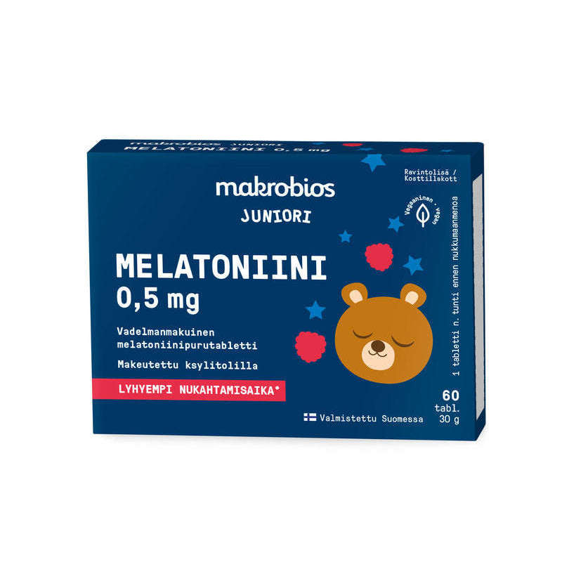 Haluaisitko, ettÀ lapsesi nukahtaisi helpommin ja levollisemmin? Makrobios Mieto Melatoniini 0,5 mg on vadelmanmakuinen melatoniinitabletti, joka auttaa lyhentÀmÀÀn nukahtamisaikaa.