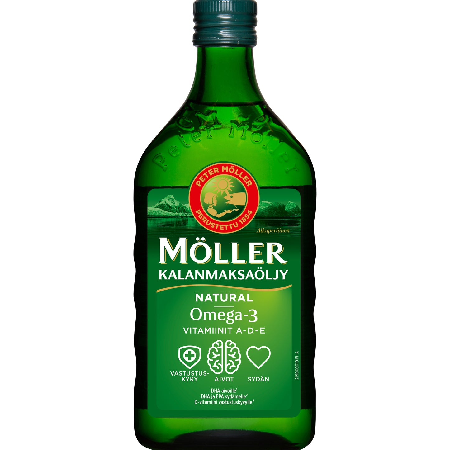 Möller Kalanmaksaöljy sisältää välttämättömät omega-3-rasvahapot (DHA + EPA) sekä D- ja A-vitamiinit. Ravintolisä.