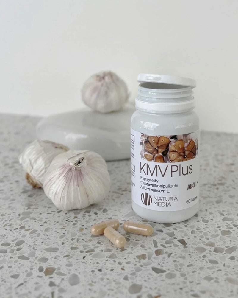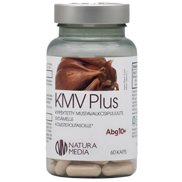 Natura Media KMV Plus on korkealaatuinen musta valkosipuli -ravintolisä, joka tukee sydämen ja verisuonten hyvinvointia sekä kolesterolitasojen pysymistä normaalina. Tuote sisältää patentoitua ABG10+® -uutetta, joka valmistetaan hitaasti kypsyttämällä espanjalaisista, DNA-sertifioiduista valkosipuleista ilman fermentointia tai lisäaineita.