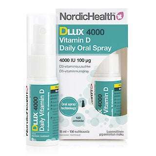 Nordic Health Dlux 4000 D3 (100 mcg) on vahva, hyvin imeytyvä ja kätevä suihkemuotoinen D-vitamiinilisä. Riittoisa pakkaus, 100 annosta!