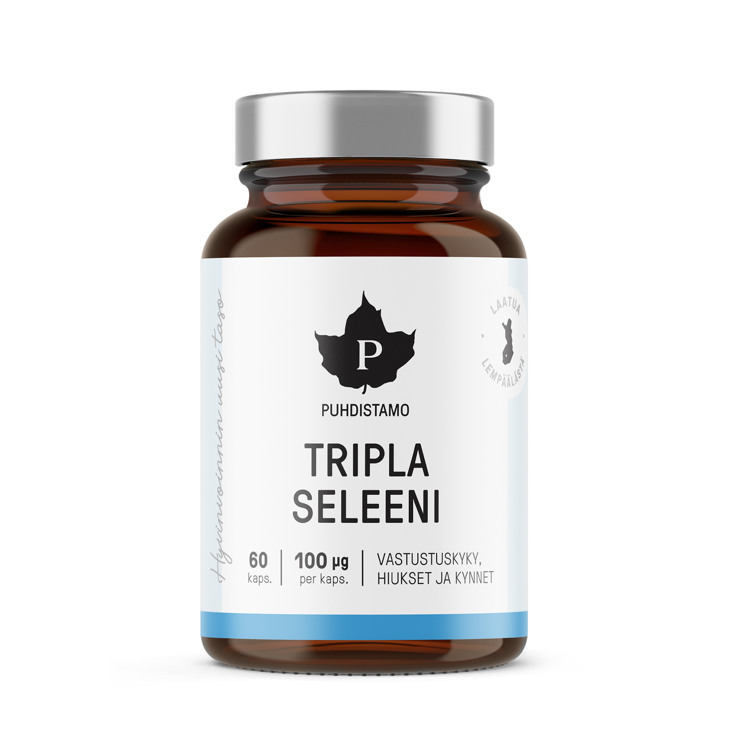 Puhdistamo Triple Seleeni on vegaaninen ravintolisä, joka tarjoaa kolmea eri seleenimuotoa: selenometioniinia, natriumseleniittiä ja seleenillä rikastettua hiivaa.