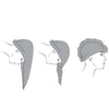 Turbaanin voi asetella laittamalla pää alaspäin ja turbaanin leveämpi, napillinen pää niskan puolelle. Kiedo hiukset turbaanin sisään ja nosta rullattu osio niskaan. Kiinnitä kuminauhalenkillä nappiin.