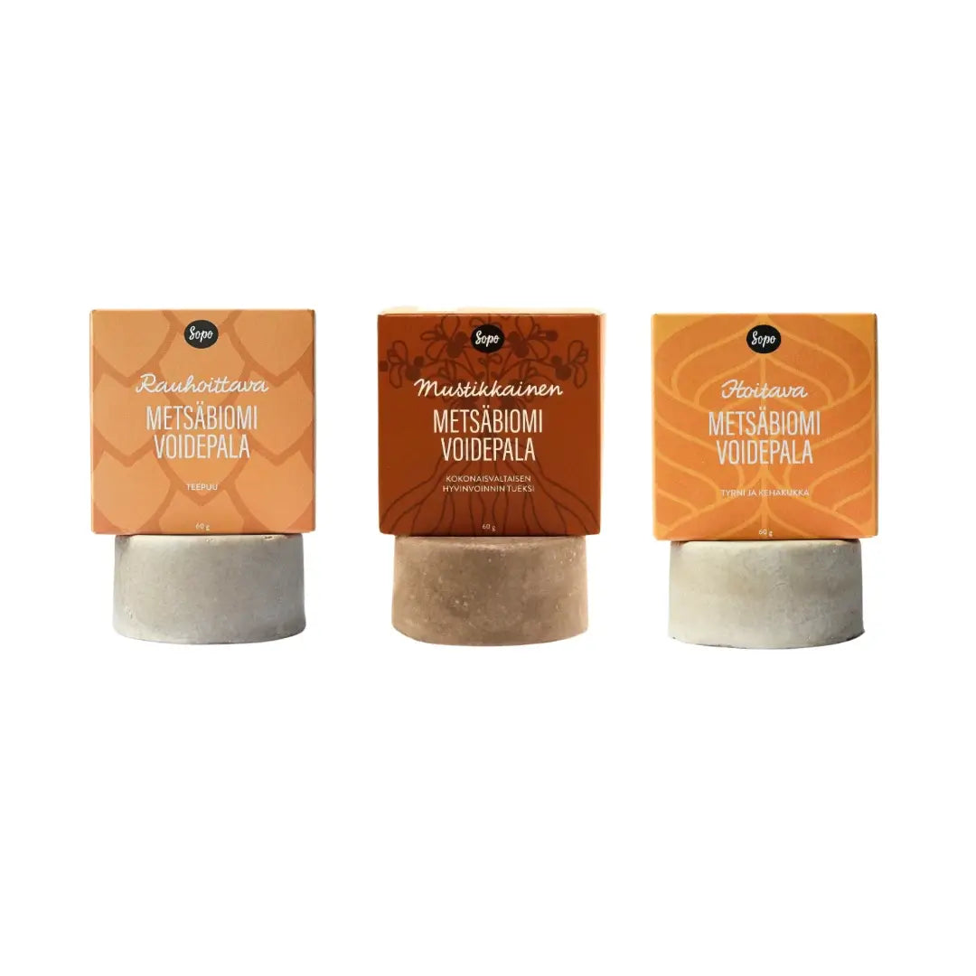 Elämyksellinen Sopo Metsäbiomi Voidepala vie sinut matkalle metsän sydämeen, tarjoten ihollesi sen parhaita antioksidantteja ja elvyttäviä ainesosia. Tämän voidepalan päivittäinen käyttö on kuin päivittäistä luontoaltistusta – se tuo metsän hyvinvointivaikutukset suoraan kotiisi.