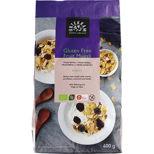 Urtekram Luomu Gluteeniton hedelmämysli on täynnä kaikkea hyvää, eikä yhtään gluteenia.